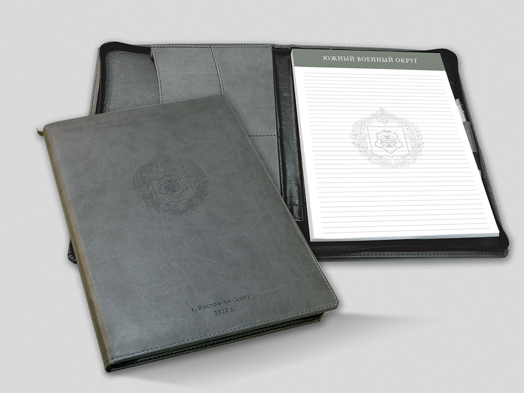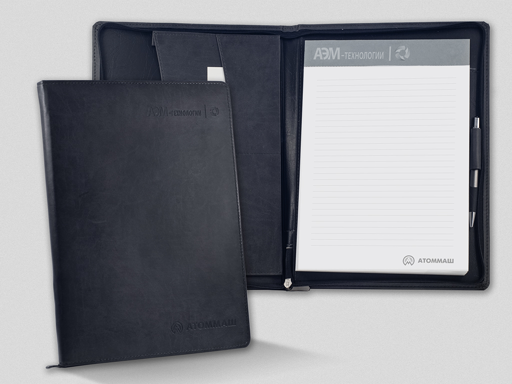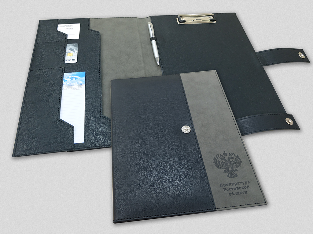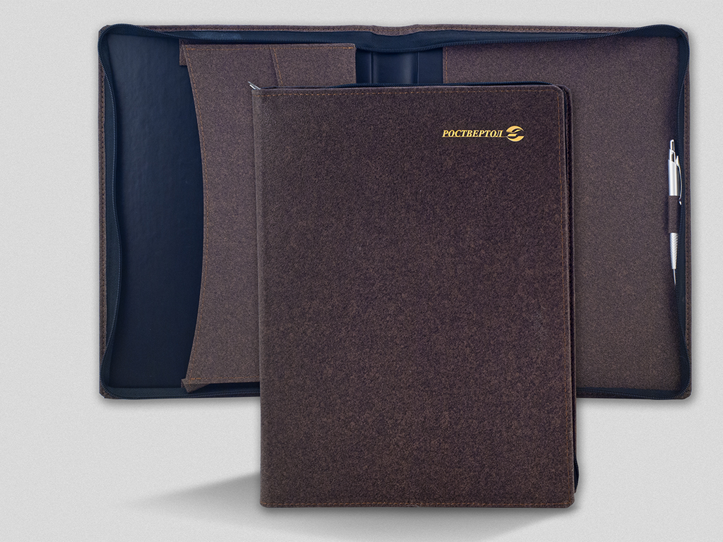 Папки-органайзеры  – очень удобный и стильный аксессуар, который используется вместо дипломата или портфеля, когда количество бумаг не очень велико. Такие папки позволяют удобно расположить бумаги, ручки, визитки и другие мелкие предметы. Папка изготавливается из высококачественных переплетных материалов и может быть оснащена застёжкой-клапаном или молнией. Для отделки и персонализации используются тиснение, металлические шильды или металлостикеры.